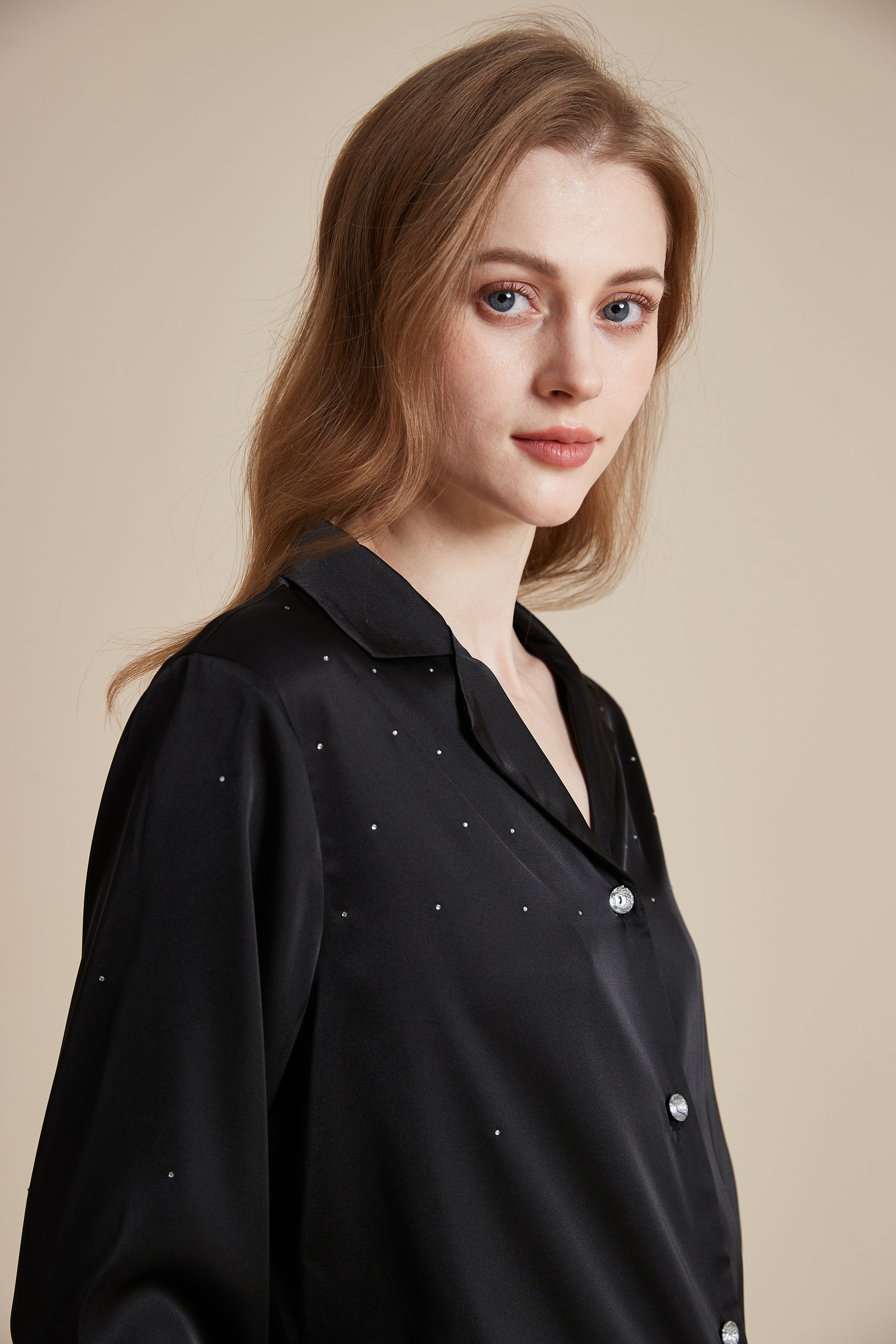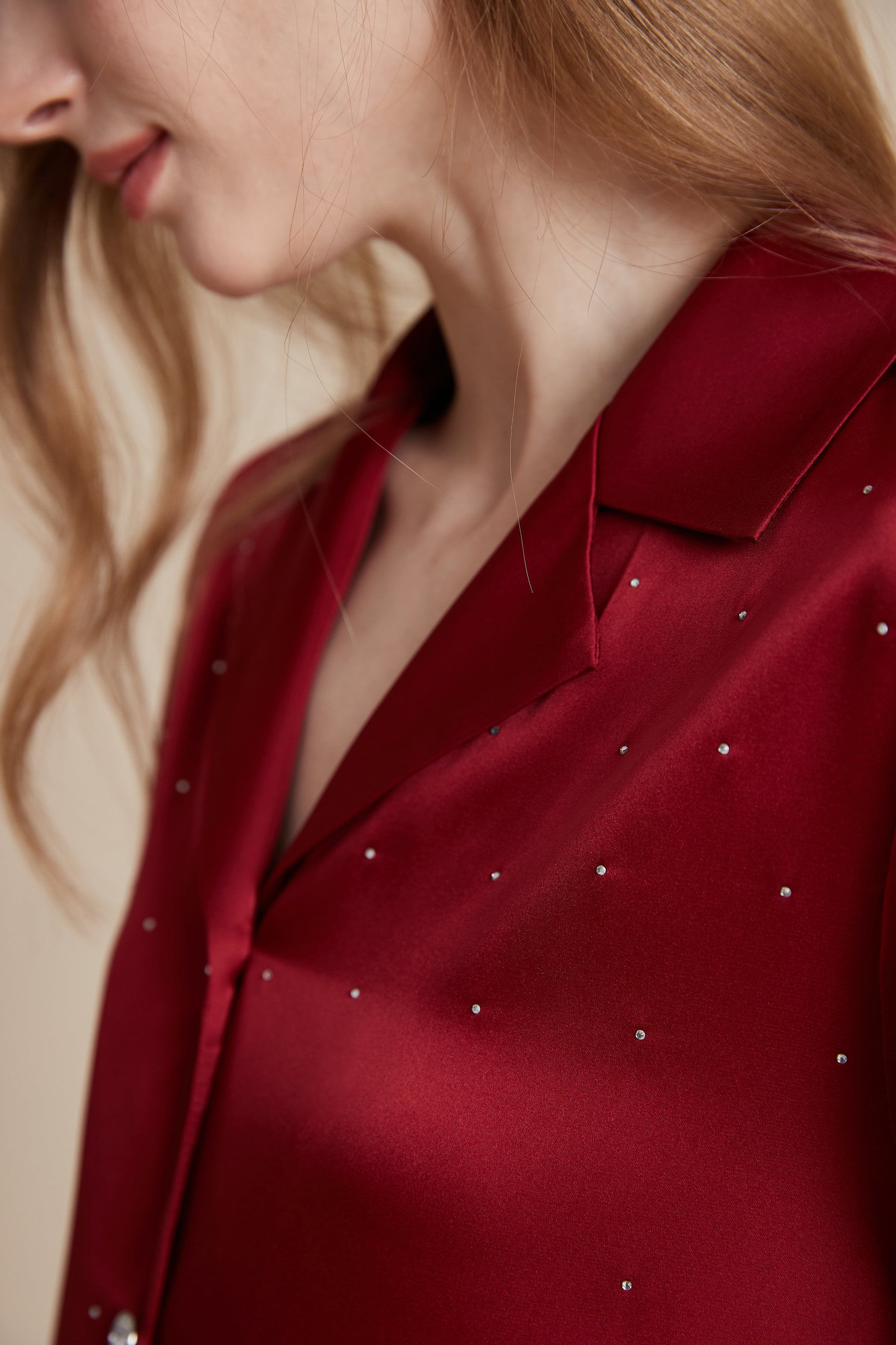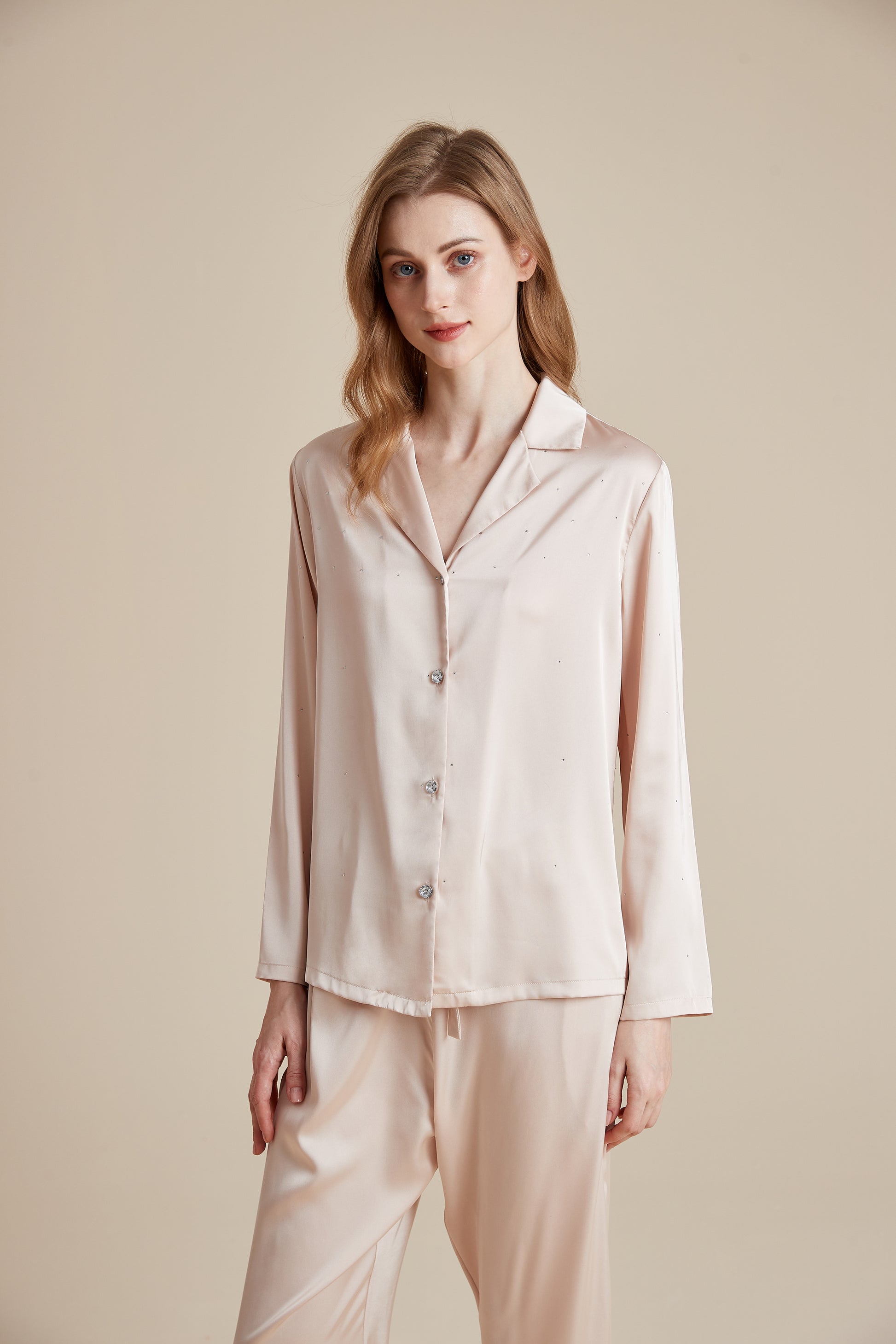 Our Pajama trimmed with rhinestone is so comfy that it can be worn again and again. Fun and flirty, this women's number will elegantly take you from couch-side to golden hour with ease.