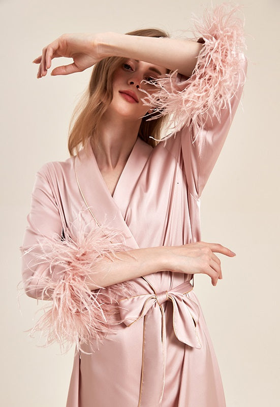 Party Long Robe Set with Detachable Feathers in Powder Pink